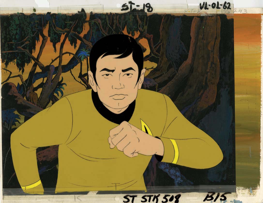 (NBC-TV, 1973-75) Set of two original animation cels which together make up the final image of Lt. Sulu, along with an original production background. The cels measure 11 in. x 14 in, with production numbers at the upper and lower margins (cels) and upper right background. Here Sulu is seen … |