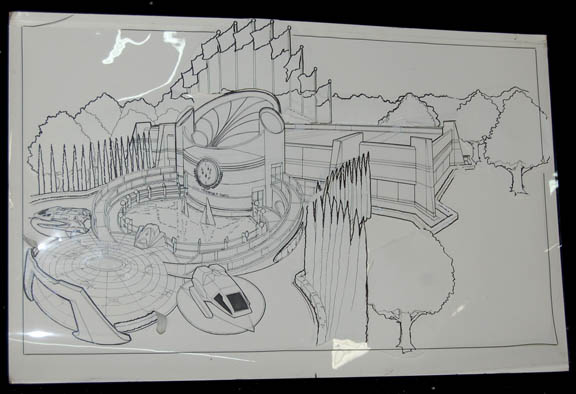 A large sketch of the Khitomer Conference site from Star Trek VI: The Undiscovered Country. The item is not original artwork, but a proof used to depict the site and additional elements. The item depicts the architecturally alien building featured in the movie with a large reflecting pool in front, … |