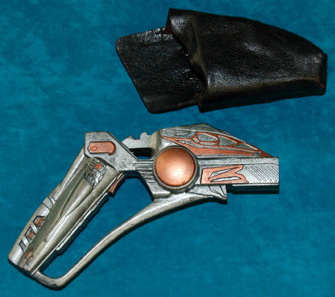 A Hirogen energy pistol featured in various episodes of Star Trek: Voyager and appearing as a Vulcan energy pistol in the Star Trek: Enterprise episode “Kir'Shara”. The item is high quality molded rubber painted metallic silver with bronze colored accents, and it comes with a leather holster with a military … |