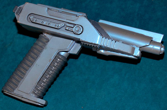A prop machine gun similar to those featured in the tenth Star Trek feature film, “Nemesis”, by the ‘Kolarans' during the ‘Argo’ chase sequence. This black molded-rubber prop replica of an ‘FN P-90’ submachine gun has been modified to appear ‘alien’ with a “clip” inserted in the bottom of the … |