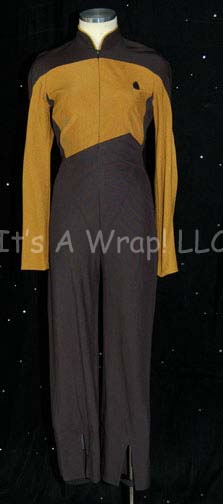 A Starfleet uniform made in the style of Star Trek: The Next Generation and reused in the seventh Star Trek feature film “Generations”, it features black shoulders with an Operations Gold chest, back, sleeves, and around the Mandarin collar; black waist and legs that end in stirrups. This particular uniform … |