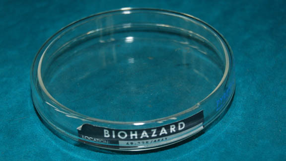 A prop glass Petri dish like those appearing in various episodes of Star Trek: Enterprise on the set of Dr. Phlox’s sickbay. The item is a glass dish with a larger glass lid. The dish features an adhered Starfleet inventory application reading ‘Biohazard’ and giving the inventory location. The lid … |