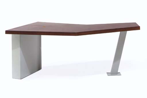 An irregularly shaped wood desk with simulated woodgrain tabletop, cantilevered design with angled steel support on the open end, a replica of Captain Kirk's desk on the original <I>Starship Enterprise</I> -- <I>69x29x50in.</I> -- featured as the desk in the Captain's quarters aboard the <I>Starship Defiant</I> in "In A Mirror Darkly, … |