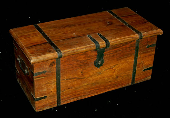 This chest was used as set dressing in the filming of Star Trek episodic television. It's wooden with metal braces on the corners, two decorative metal strips across the hinged lid, metal handles on each end and a metal latch on the side that can be closed with a lock … |