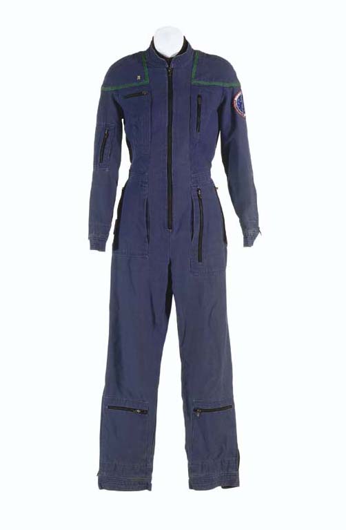 A blue <I>NX-01</I>-style jumpsuit with green shoulder stripes, embroidered <I>Enterprise</I> mission patch, ensign's rank pips, and black undershirt -- made for Linda Park as Ensign Hoshi Sato on <I>Star Trek: Enterprise</I> (2) |