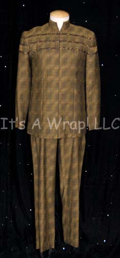 A costume featured in the last Star Trek feature film, “Nemesis” and reused in the Enterprise episode “Demons” as jumpsuits for the ‘Orpheus Mining Colony’ on the moon. This costume consists of a long-sleeved, full-length jumpsuit in a distressed, aged, yellowed brown color featuring diagonal quilting along the shoulders, Velcro … |