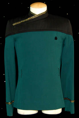 A Starfleet dress uniform jacket and boots featured variously for special occasions throughout Star Trek: Deep Space Nine episodic television until the redesign late in the series. This jacket is in Science division blue featuring black shoulders, the cuffs and collar ringed in gold that continues just under the right … |