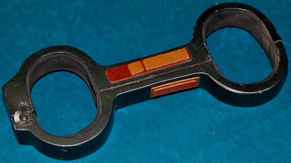 A set of high quality cast resin manacles painted metallic gunmetal with metallic orange accents featured in the Star Trek: Deep Space Nine episode “Tacking into the Wind”. The mancles are a pair of loops with foam padding inside for comfort of wear that open on a hinge and remain … |