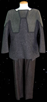 A costume from the Star Trek: Deep Space Nine episode “Shakaar”, wherein “Major Kira Nerys” (Nana Visitor) runs afoul of her old Resistance cell leader when he refuses a government order to return some farm equipment. The costume is for wear by Duncan Regher in the role Shakaar Edon, leader … |