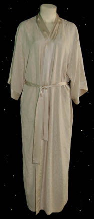 A robe located in the section of items corresponding to Jeri Ryan who portrayed “Seven of Nine” in Star Trek: Voyager. The robe is slightly peach colored with textured flower pattern and silk trim. The robe features a waist tie and an original manufacturers tag indicating the item to be … |