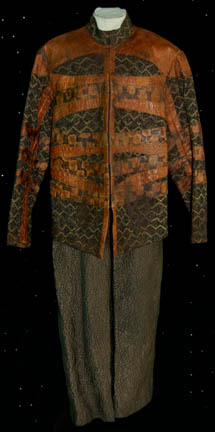 A costume featured in the Star Trek: The Next Generation episode “Inheritance” for wear by an “Alien Aid”. The costume is a two piece rust colored wool crepe jacket and trousers. The costumer's tag indicates wear by ‘Johnaton Paley’ and asserts a ‘rust brocade midriff inset with pocket–nehru collar’. |