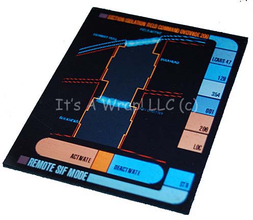 A display graphic for a tricorder created for Star Trek X: Nemesis during the scene in which “Data” (Brent Spiner) leaps from the “USS Enterprise-E” and “Geordi LaForge” (LeVar Burton) disables a force field to allow him to do so. The item depicts the location of a pair of force … |