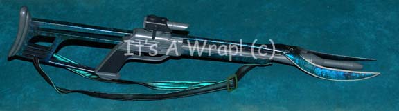 A prop energy weapon featured in Star Trek X: Nemesis for use by Reman soldiers. The item is a Reman rifle, a cast resin rifle with a metallic purple paint job, a vinyl shoulder strap, a metal double bayonet beveled and painted to appear sharp, with a trigger button that … |