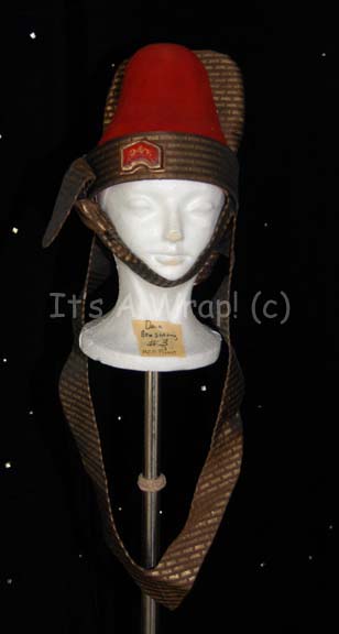 A costume element similar to those featured in various Star Trek feature films. This item is a rust-colored, felt, hat in the Vulcan-style featuring metallic brown and gold-colored stripes around the lip of the hat forming a chinstrap and second strap that comes to a point on the chest; a … |