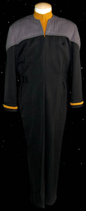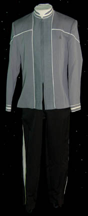 A costume featured in Star Trek X: Nemesis for wear by actors portraying the band at the Riker-Troi wedding. The costume is a pair of black trousers with gray trim and white piping on the outer seams with a gray Starfleet uniform jacket featuring the same white piping and a … |