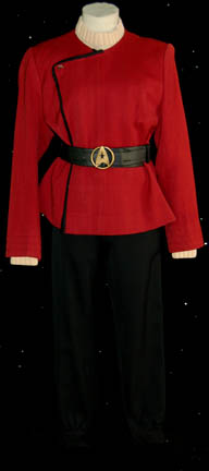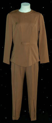 A costume featured in Star Trek I: The Motion Picture, a brown colored Starfleet class-A uniform with trousers and a uniform top with an unattached plastic bio-monitor and unattached shoes. The costume is intended for female actors. |