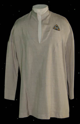 A costume featured in Star Trek I: The Motion Picture for wear by characters on board the ‘Epsilon IX Station'. The costume is a gray colored shirt with an open neck and an affixed yellow backed ‘Epsilon IX’ assignment patch on the left breast. |