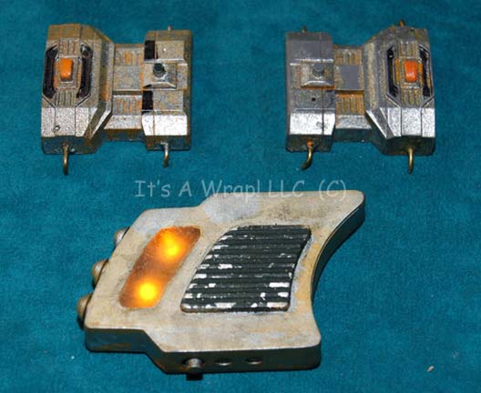 A lot of props featured in the Star Trek: Enterprise episode “Borderland” for use by Orion Guards in the discipline of their prospective slave sales. One item, the ‘neurolytic restraint activator’ is made from molded resin with metal screw details, and a flashing yellow light. The item is powered by … |