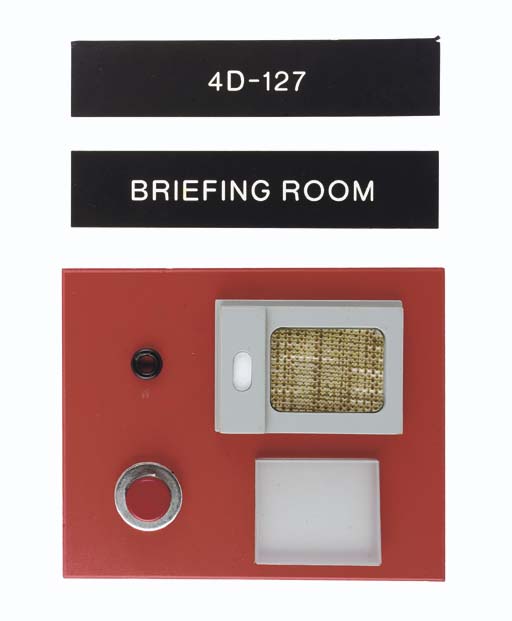 Two black plastic signs with white lettering, both -- <I>9½x2in.</I>; and a red plastic panel with prop intercom controls -- <I>8x10in.</I> -- all used in the <I>Starship Defiant</I> corridor set in "In A Mirror, Darkly, Part II" in <I>Star Trek: Enterprise</I> (3) |