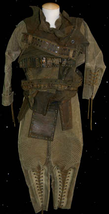 A costume featured in Star Trek X: Nemesis for wear by Kolaran Raiders attacking an away team from the “USS Enterprise-E”. The costume is a full length jumpsuit with quilted accents, and lace up size adjustments at the ankles and cuffs with an elaborate chest piece of olive drab colored … |