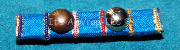 A Starfleet officer’s campaign ribbon created for Star Trek VI: The Undiscovered Country and of the style appearing in Star Trek VII: Generations. The item is fabric covered sheet plastic with twin pin backs appearing as blue with multiple multi-colored stripes trimmed with shiny gold lining and embellished with a … |