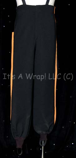 A costume element of the style featured in Star Trek feature films from “The Wrath of Kahn” to the opening scenes of “Generations” and reused in the Star Trek: Voyager episode “Flashback”. This item is overall-style, black Starfleet uniform trousers featuring an Operations gold stripe down the side with stirrups … |