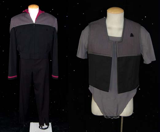 (Paramount, 1994) Geordi La Forge uniform consisting of a black jumpsuit with elastic waistband and zipper front, purple long sleeved uniform undershirt, jumpsuit and tunic both have Star Trek VII handwritten labels “Lavar Burton”, comm badge, three rank pips, and costumers tag written “Geordie, Lavar Burton, change number 3, Scenes … |