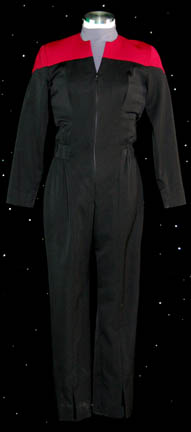 A female Command Red Starfleet uniform made for wear during the Star Trek: Voyager series. The uniform is black with Command red shoulders, a small Velcro patch on the left breast for a Combadge (not included) to attach, a zip up the front and two pleats in the back. Around … |