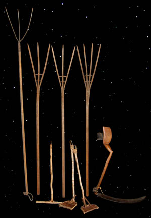 A lot of farm tools and implements featured in various episodes of Star Trek: Deep Space Nine such “Progress” and “Shakaar”. This lot consists of three wood, medieval-style rakes, one with a wood handle and metal tines; three primitive hoes of wood and what appears to be wood bark or … |