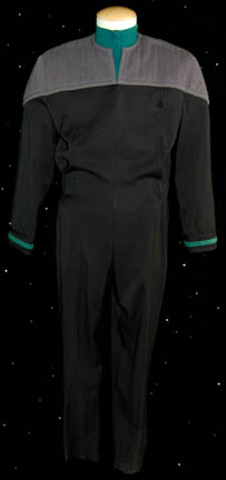 A Star Trek: Deep Space Nine male Sciences Blue Starfleet uniform made for wear during the series. The jumpsuit is black with gray quilted shoulders, blue trim around the cuffs, Away Team gear loops around the waist, a zip up the front and a small Velcro patch on the left … |