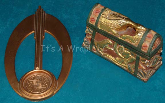 A pair of set dressing items appearing in the Star Trek: Voyager episode “Repression” in the shadowed offices of former Bajoran Maquis member “Teero Anaydis” (Keith Szarabajka). The items are an official emblem of Bajor and a carved wooden box with a hinged lid. The emblem is a molded resin … |
