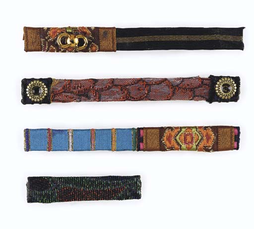 Four <I>Star Trek VI</I>-style Starfleet campaign ribbon bar pins, each covered with colorful strips of metallic gilt fabric, some with glued-on decorative detail -- made for Starfleet flag officers at Starfleet Command in <I>Star Trek VI: The Undiscovered Country</I> (4) |