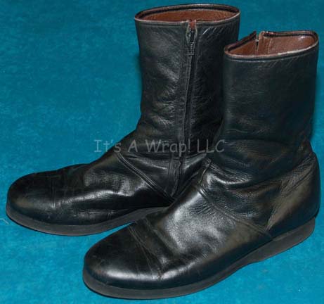 A pair of shiny black leather boots for a male Starfleet costume uniform (sold separately). The boots have a slight heel and inner zips, are believed to be size 11 as no visible size is apparent, and are inscribed internally ‘Jonathan’. |
