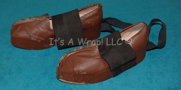 A pair of shoes made to accompany the costume of Marc Alaimo portraying “Gul Macet” in the Star Trek: The Next Generation episode “The Wounded”. The items are ‘Scandro’ name brand shoes with brown vinyl additions to match the costume. Black elastic strips are affixed to the shoes to attach … |