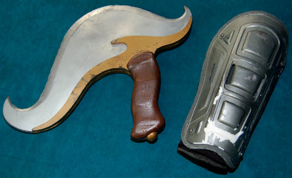 STAR TREK: DS9 “THE ABANDONED - ALIEN BLADED WEAPON” An expertly crafted molded rubber prop weapon made to appear as a large, curved bladed knife and a forearm shield. The items appeared in the Star Trek: Deep Space Nine episode “The Abandoned” during which an infant ‘Jem’Hadar’ clone arrives on … |