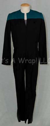 A costume featured in various episodes of Star Trek: Deep Space Nine. This costume consists of a sleeveless, full-length, jumpsuit with the top half a black, spandex-like material, the bottom being neoprene over a gray fabric featuring a starburst pattern down the middle and stirrups for the feet; a distressed … |