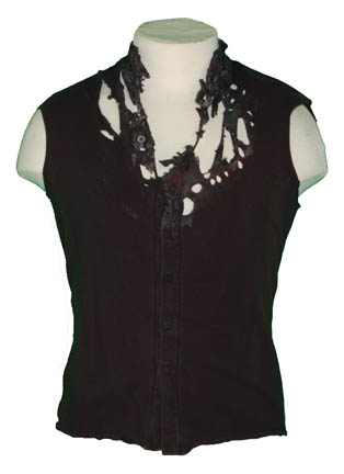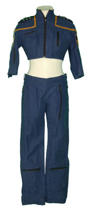 A costume featured in the Star Trek: Enterprise episodes “In a Mirror, Darkly, Parts I and II” for wear by Jolene Blalock in her portrayal of “Commander T'Pol”. The costume is a Starfleet Uniform from the Mirror Universe, thus it is hip hugging cropped trousers with a midriff bearing cropped … |