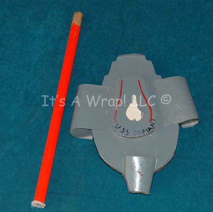 A camera test model created for Star Trek: Deep Space Nine that represents the “U.S.S. Defiant”. The item is multi-layered foam core painted gray with red detail lines penned in and both the name and registry numbers of the ship inscribed in their appropriate locations, the starboard side markings are … |