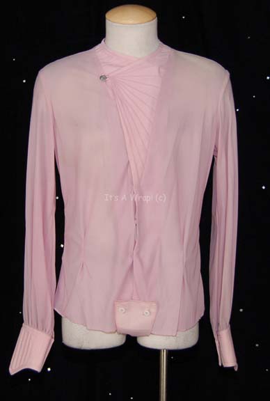 A costume element featured in the fourth Star Trek feature film “The Voyage Home” for wear by William Shatner in the character he made famous “Admiral James T. Kirk”. This item is a salmon-colored long-sleeved shirt made fromo a sheer material and featuring an asymmetrical button front, ray-patterned inverse triangular … |