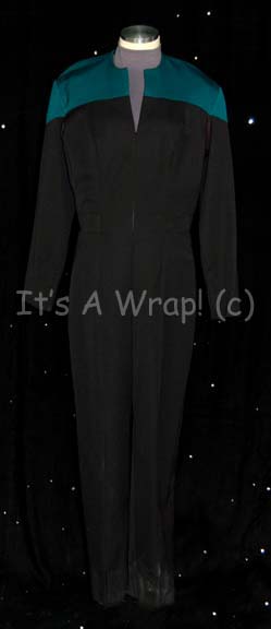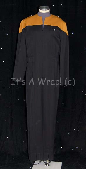 An unfinished Starfleet uniform like those appearing in episodes of Star Trek: Voyager. The costume is a black jumpsuit with operations gold division shoulders, a front zip, Velcro adjustments at the sleeve cuffs, an unfinished internal belt, an elastic waist, and no ‘away team’ gear loops. The jumpsuit is accompanied … |
