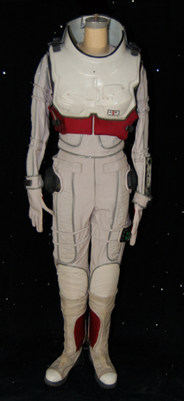 A Starfleet space suit worn by Jeri Ryan in the Star Trek: Voyager episode “One Small Step”. The costume is an off white spandex jumpsuit with a matching cropped jacket, a pair of boots, gloves, and a chest and back casing. The jumpsuit features multiple fashioned tubes, knee padding, molded … |