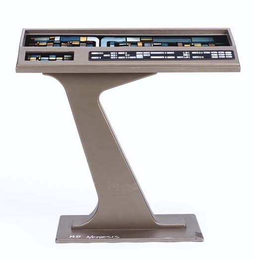A prop Starfleet LCARS-style control console, with operating internal lighting including blinking lights, painted metallic bronze, with silkscreened plant-on button panel, labeled with paint marker on base <I>N.D. Nemesis</I> -- <I>42½x45x15½in.</I> |