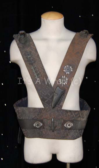 A costume element featured in the Star Trek: Voyager episode “Memorial”; wherein certain members of the crew start having dreams and visions of fighting in a horrific war centuries past. This item resembles the belt/harnesses worn by Jem’Hadar soldiers in DS9 in that they are made of the same dark-gray … |