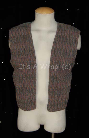 A costume element like those featured in various episodes of Star Trek: Voyager for wear by Garrett Wang as “Ensign Harry Kim”. This item is a gray vest featuring a multi-colored stripe pattern and a raised hexagonal design down the front. A sewn in Voyager tag denotes wear for ‘Garrett … |