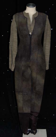 A costume featured in the Star Trek: Voyager episode “Flesh and Blood”; wherein “Voyager” answers a distress call from a Hirogen base that has been utterly decimated by the holograms from the holodeck technology that “Captain Janeway” (Kate Mulgrew) gave them. This costume is a long-sleeved, full-length, gray-green jumpsuit featuring … |