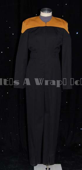 A costume like those featured in various episodes of Star Trek: Voyager for wear by Kate Mulgrew as “Captain Kathryn Janeway”. This costume is a variant on the normal Starfleet uniform jumpsuit in that it consists of black, uniform trousers sewn on to the long-sleeved, blue/gray undershirt and a black, … |