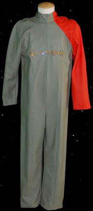 An excellent gray jumpsuit with an orange sleeve and working electronic lights featured in the Star Trek: Voyager episode “Repentance”. The lights are powered by a single 9volt battery held internally that activates by way of a switch. The costume features a sewn in ‘MUTO Little, Los Angeles' tag and … |