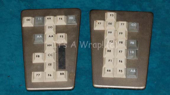 A lot of two similarly fashioned console inset button boards like those appearing on the set of the “Orpheus Mining Colony” in the Star Trek: Enterprise episode “Terra Prime”. The items are trapezoid shaped and feature rounded edges and corners, the faces of which are painted metallic silver with rubber … |