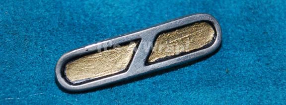 A metal provisional rank pin made for ‘Maquis' crewmembers who integrated into the Starfleet crew of “USS Voyager” following their displacement into the Delta Quadrant during the pilot episode of Star Trek: Voyager, “Caretaker”. This pin indicates the provisional rank of ‘ensign’ due to its molded single stripe. A slightly … |