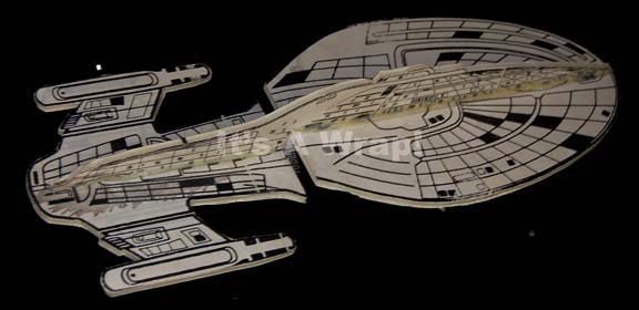 A white foam core camera test model like those used in Star Trek: Voyager. The item is a representative of an “Intrepid-Class” starship and is composed of multiple sheets of fashioned white foam core with graphic photocopies applied to the dorsal side. The item is believed to have been used … |